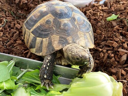 ヒガシヘルマンリクガメの「ヘルシー」 今日のごはんは「青梗菜と大根の葉」 ん~今日はタンポポないの? 食い付きが良いのは野草類なのですが、徐々に収穫量が減り、葉野菜も食べてくれないと・・・